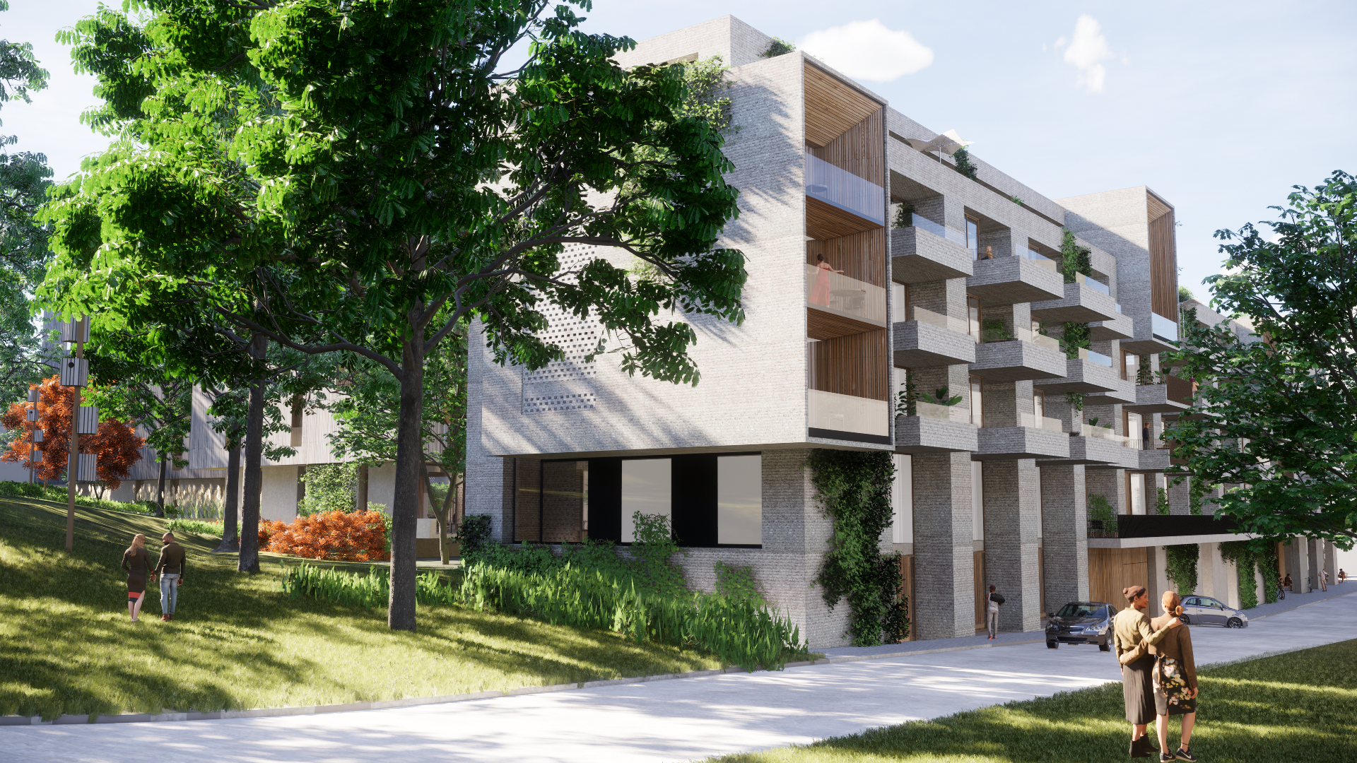 Mot nord og «den grønne ringen» ligger de frittstående punkthusene «parkboligene». Punkthusene muliggjør siktlinjer fra gårdsrommet og byboligene ut til park-området. De nærmest kvadratiske volumene er utformet med større vertikale slisser som gir en opplevelse av porøsitet til volumet, i tillegg til en naturlig avgrensning for balkongene. Parkboligene tenkes kledt i oljet malmfuru som over tid får samme toner som murverket fra byboligene. Selv om Parkboligene og Byboligene representerer to forskjellige typologier er det også et slektskap mellom dem i form av størrelse på fasadeelementer, materialitet og skala.