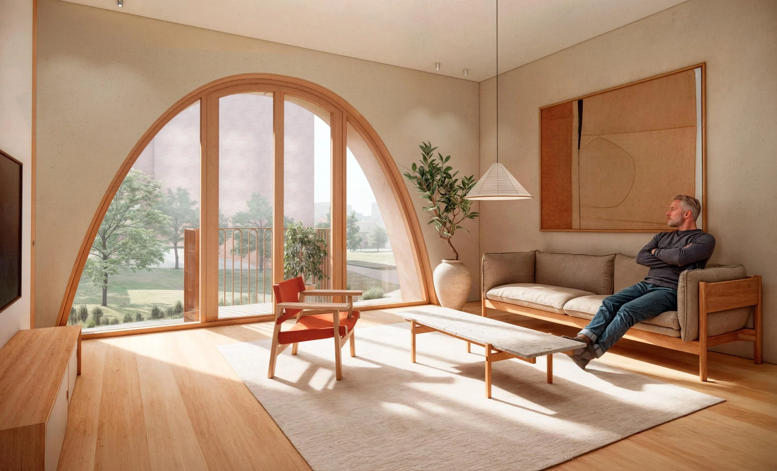 Sokkel-motivet bidrar til å bryte ned skalaen på fasaden mot parken. Sekvensen av høyreiste buer i basen vil skape en sterk fasaderytme langs parken. Bebyggelsen er en sammenstilling av ulike del-bygg, alle med tegl som hovedmateriale, og der sekundære felt er supplert med kledning av tre-panel.