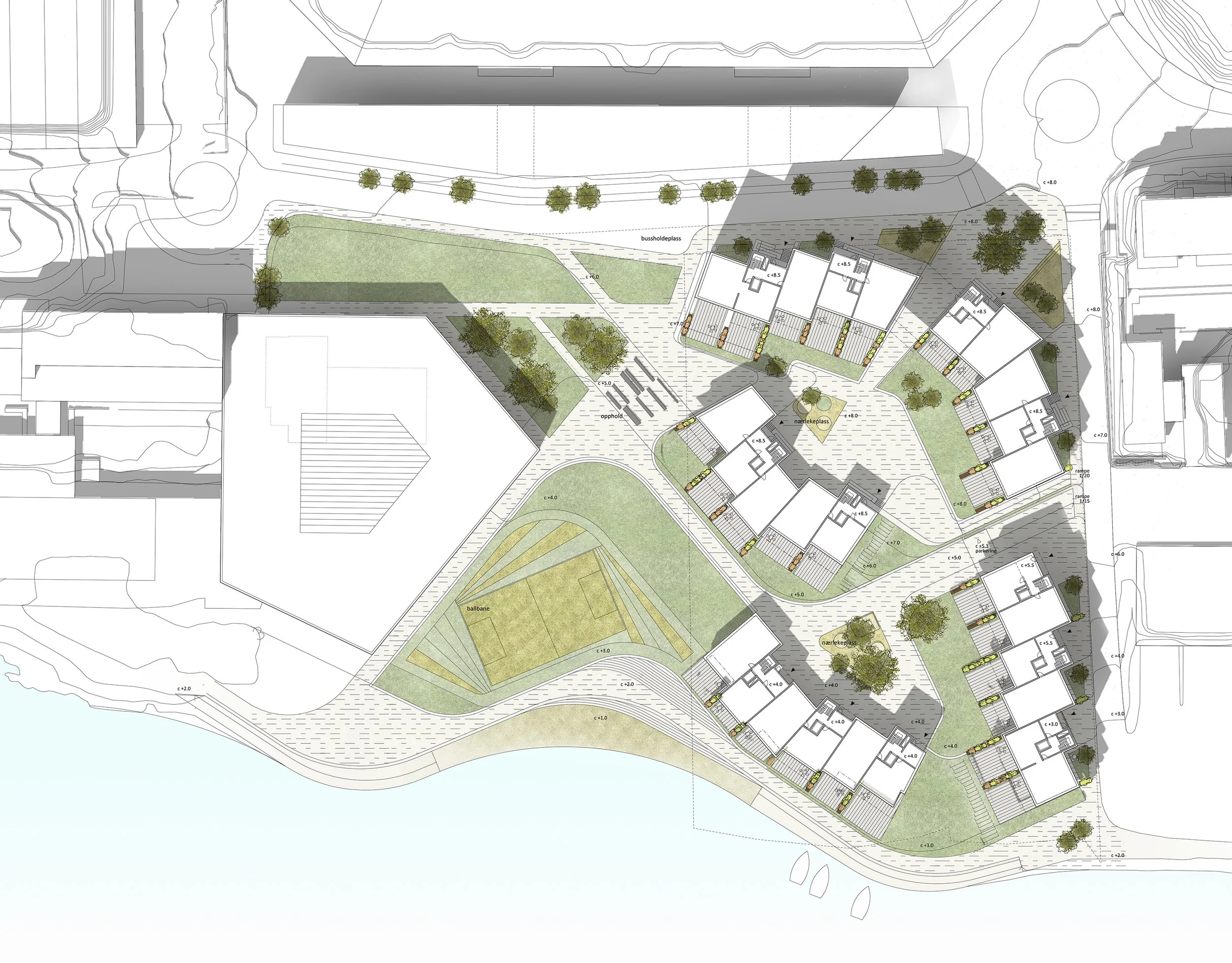 Med tanke på de omkringliggende bygg, samt ønsket om å opprettholde godt utsyn for beboerne, stiger bebyggelsen, fra lavest nede mot vannet, og til det høyeste i tomtens bakkant.