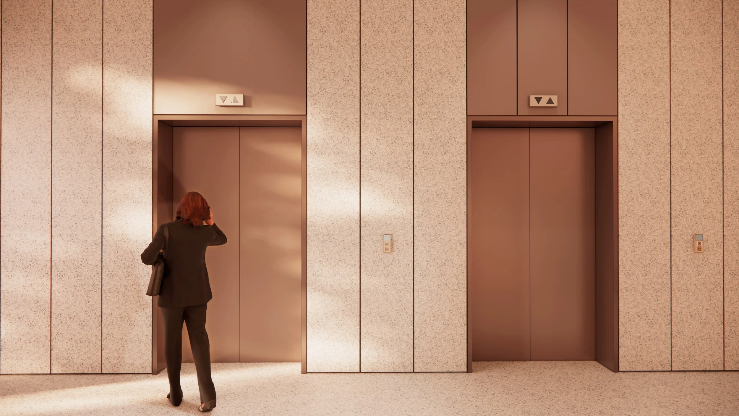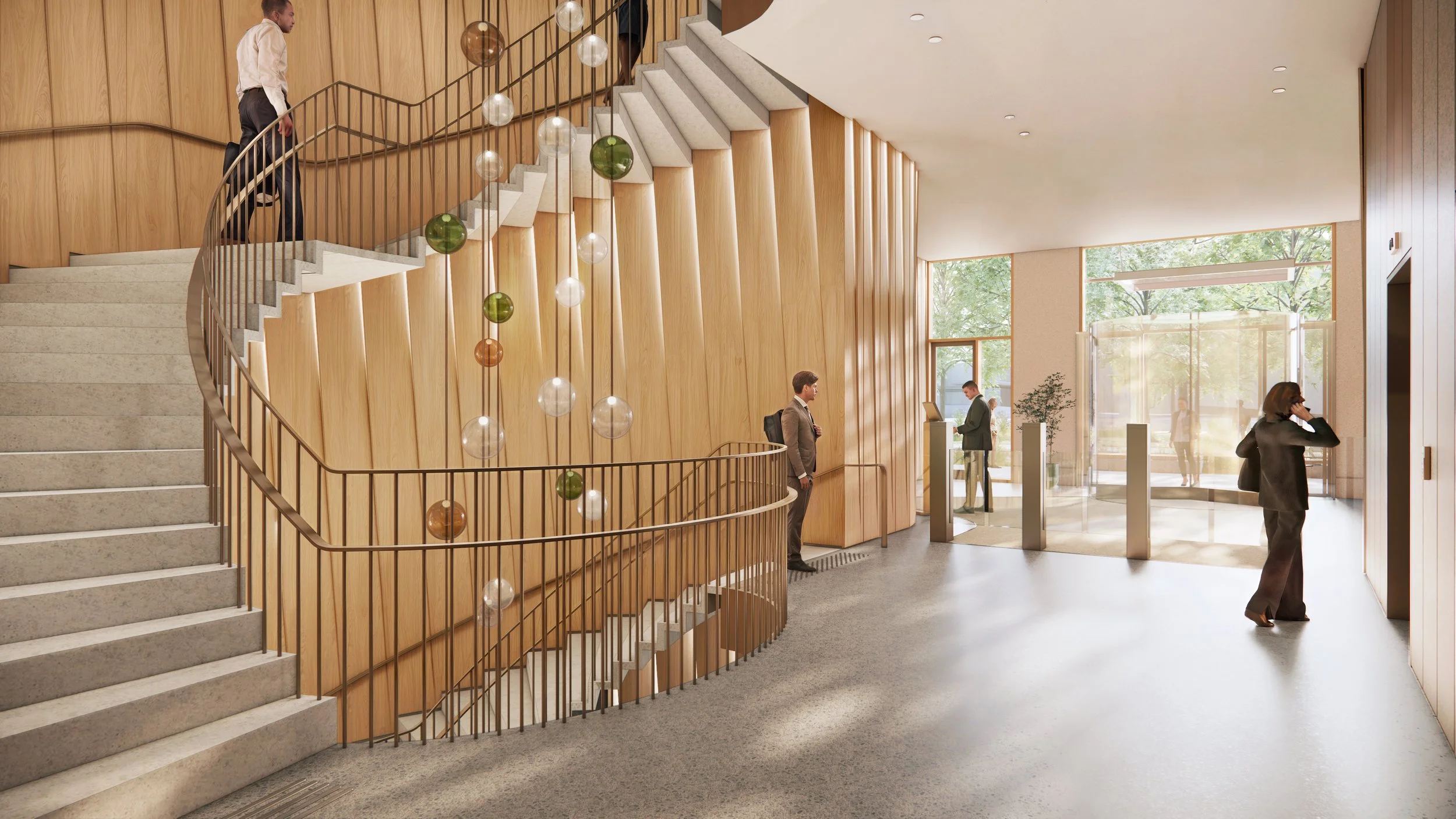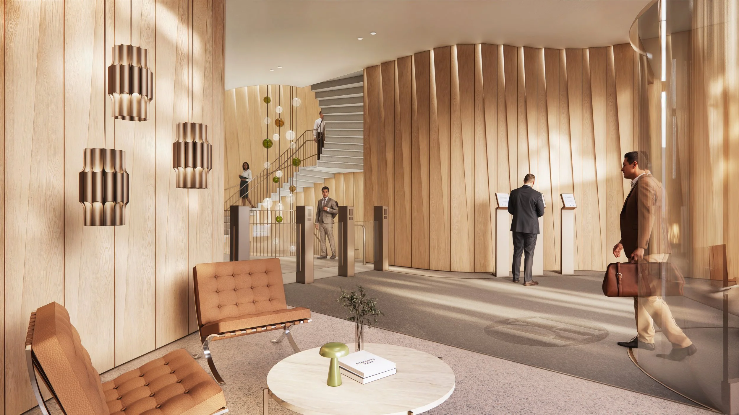 Fargepaletten er dempet og naturlig, med innslag av taktile materialer som tre, stein og tekstil som gir varme og robusthet i bruk. Detaljer som spesialtilpasset inventar, integrert belysning og akustiske tiltak er nøye utformet for å sikre høy brukskvalitet og et rolig, behagelig romklima.