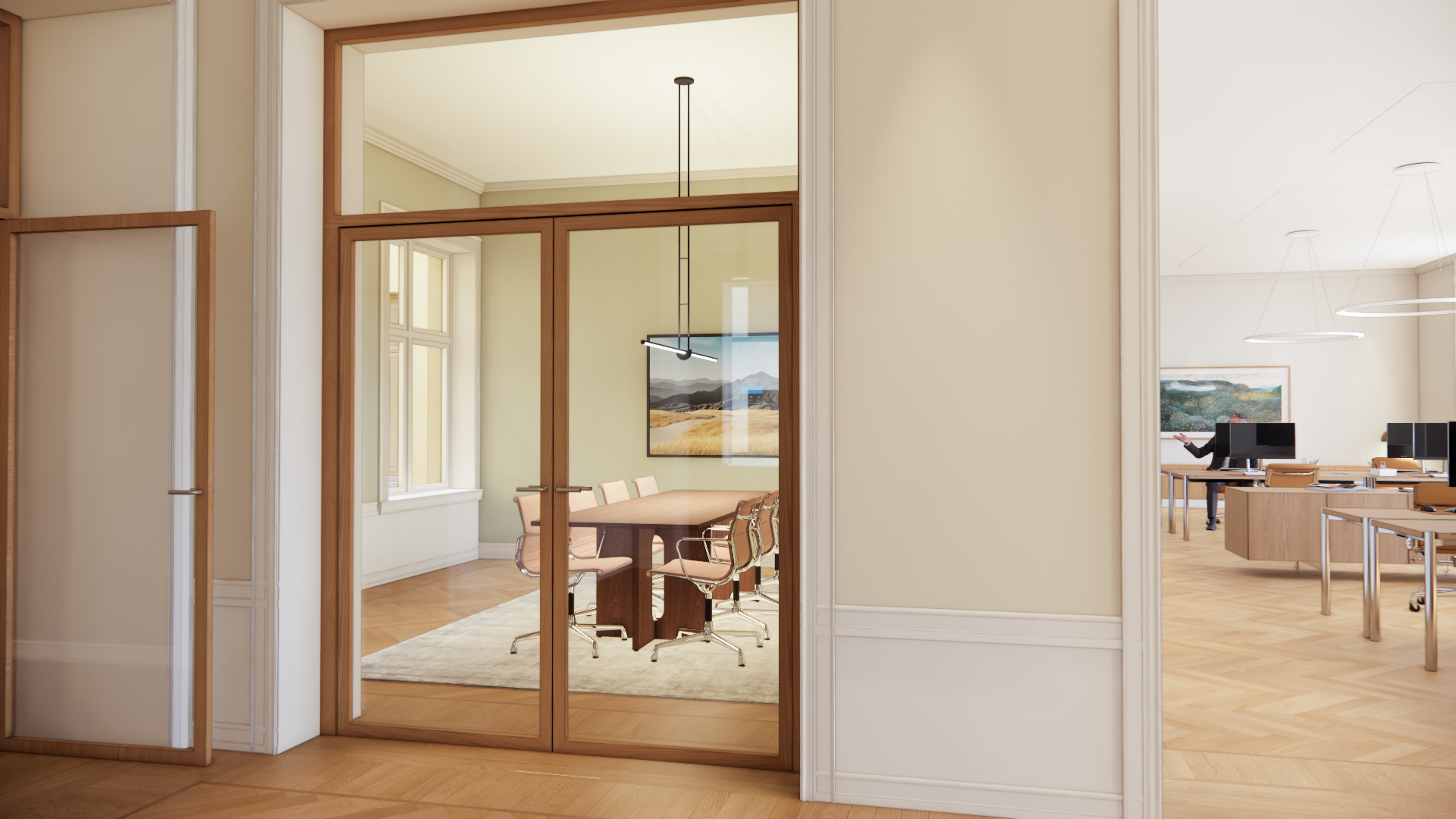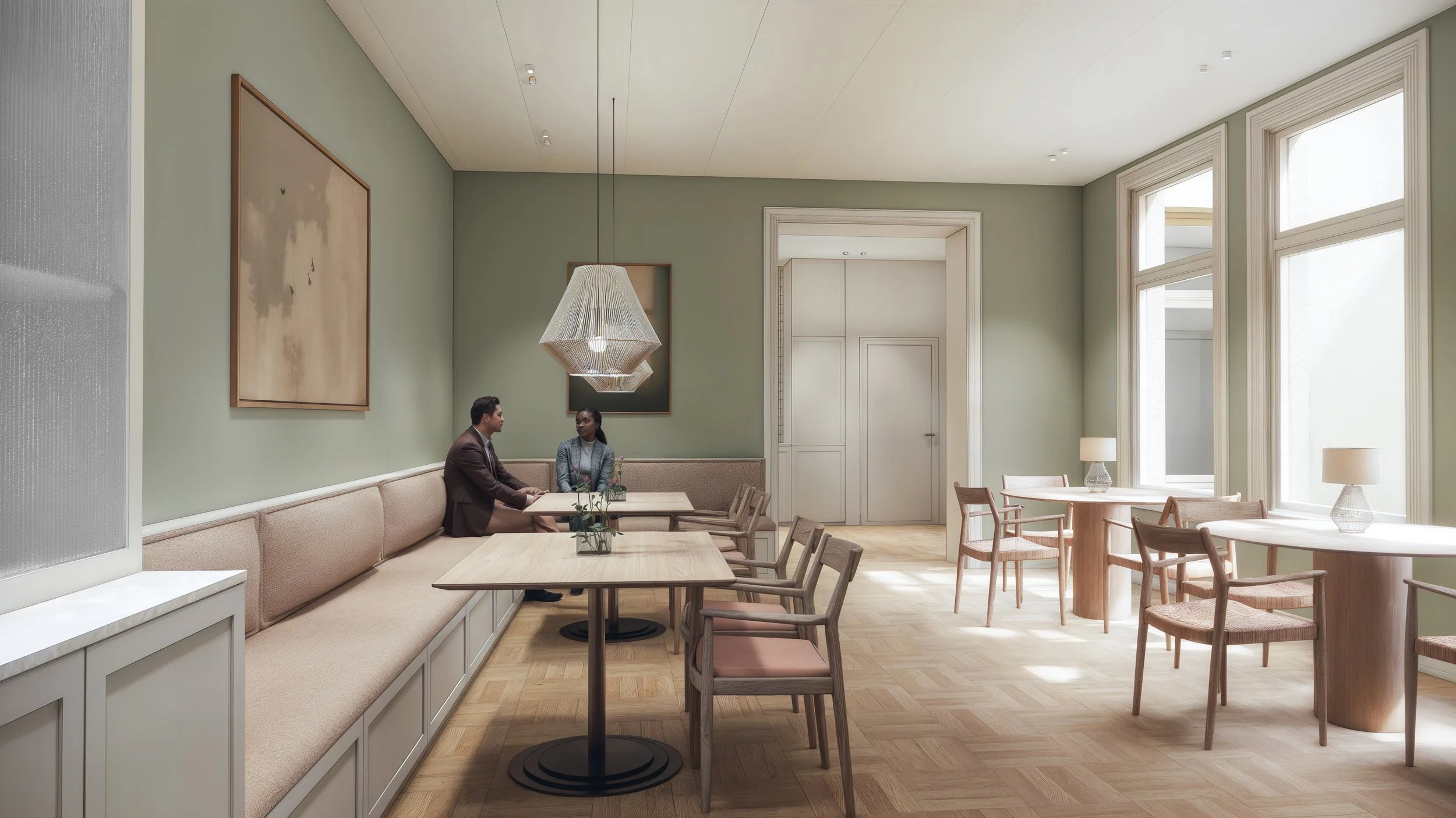 På plan 1 etableres det fellesfunksjoner i byggets bakre fløyer. Kontoretasjene oppgraderes og planløsningene justeres for å sikre bedre samhandling på tvers av etasjen, og samtidig etablere arbeidsrom og fasiliteter svarende til dagens moderne kontorbehov. De to bak-fløyene integreres opplevelsesmessig og funksjonelt, ganglinjen i fløyene flyttes frem til innside gårdsromsfasaden. Som i dag vil arealene langs og innenfor gatefasadene bli utnyttet til arbeidsplasser. Enkelte veggåpninger flyttes eller utvides i tråd med endret logistikk i ny planløsning. De nedforede himlingene vil i stor utstrekning bli sanert og opprinnelige himlinger og interiør vil bli eksponert.