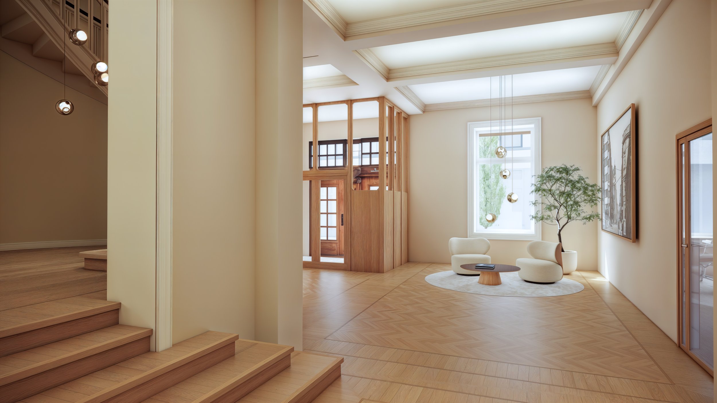 Innvendig er bygget preget av store bruksmessige forandringer, og spor av historisk interiør fremstår i hovedsak begrenset for de ulike rommene. Det legges opp til en rehabilitering hvor flere av kvalitetene blir hentet frem igjen og delvis tilbakeført. Hovedtrappen blir koblet tydelig sammen med hovedinngangen, og det foreslås å åpne opp mellom hovedtrappen og velkomstssonen. Den nye heisplasseringen reetablerer den visuelle forbindelsen til bakgården via portrommet. Den tosidige heisløsningen gjør det også mulig å nå samtlige etasjer og nivåer i bygget.