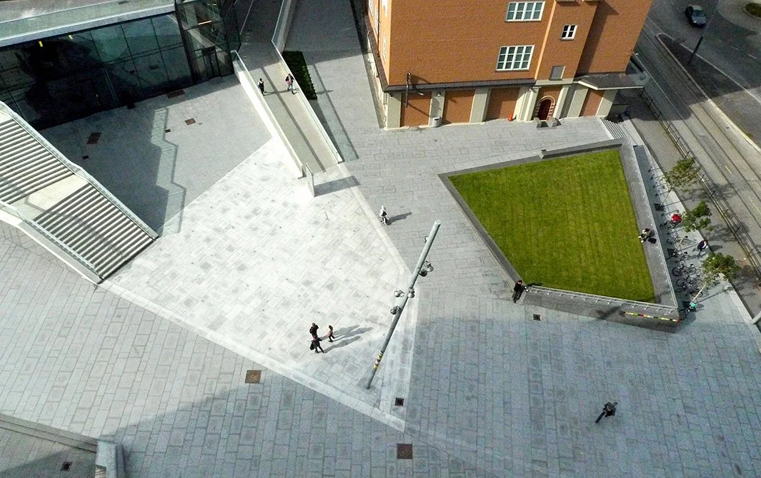 Ideen er å bruke plassens granittgulv til å binde de ulike byggene og plasselementene sammen, og å danne en familie av urbane rom som oppleves innbydende og samtidig effektive. Prosjektet ble ferdigstilt i samarbeid med Bjørbekk & Lindheim Landskapsarkitekter.