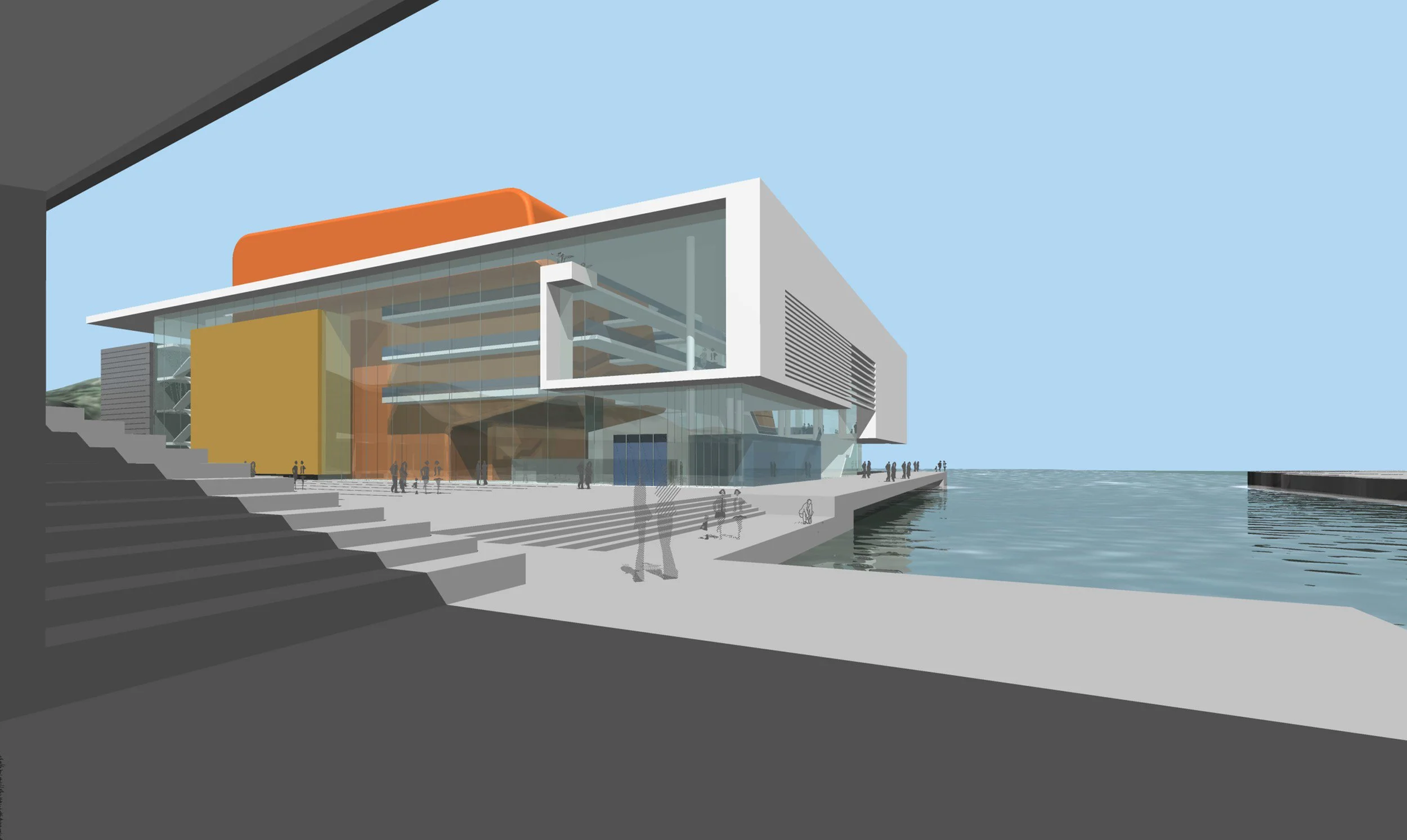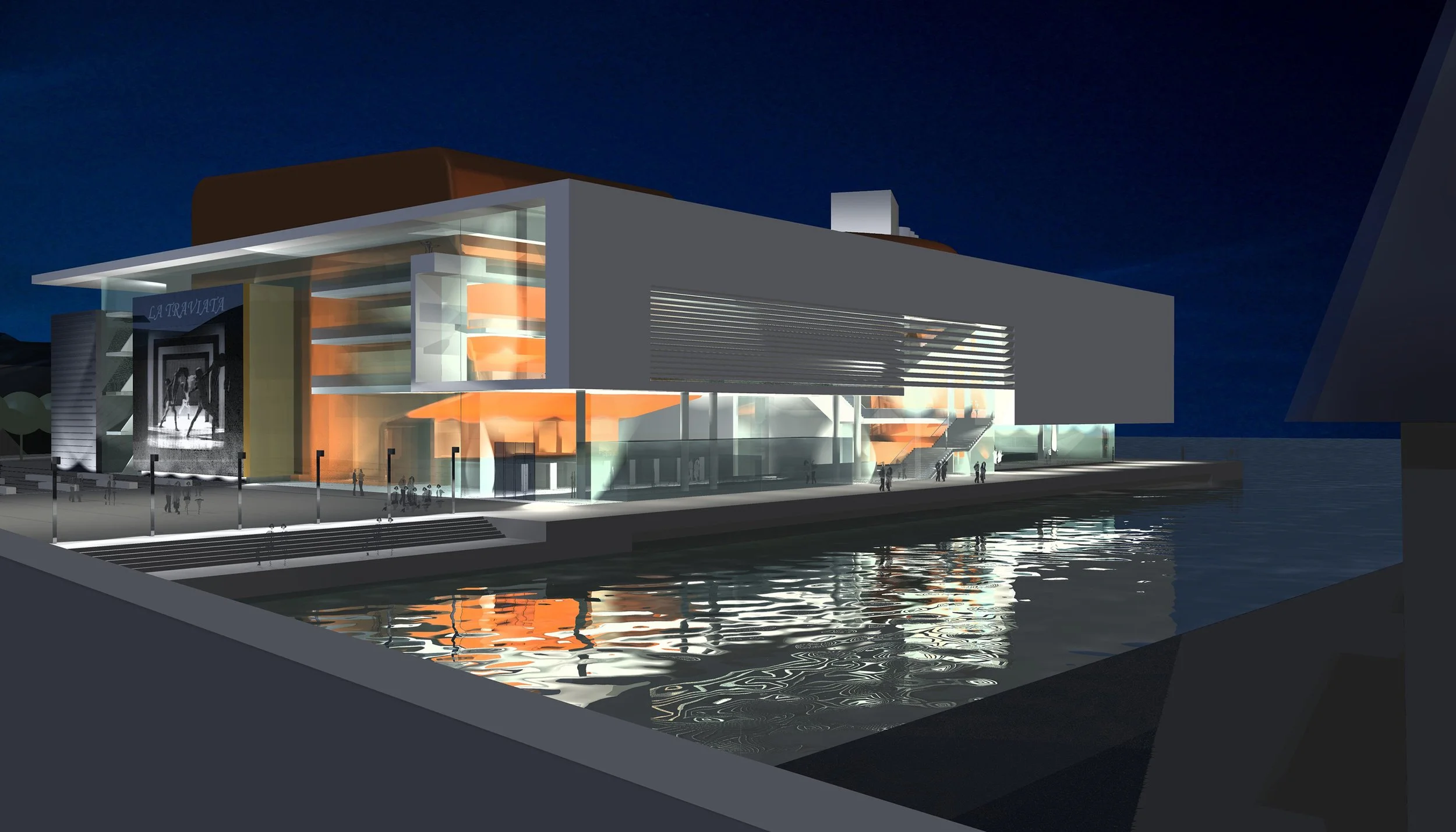 Prosjektet består av tre soner; 1) i bakkant de betjenende arealene som kubiske ”bokser”, 2) i midten de store hovedsalene som markerte, plastiske volum, og 3) i forkant de åpne foajearealene m/ tilhørende publikumsfunksjoner.